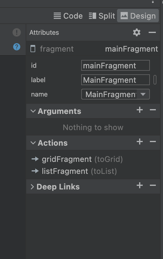 args 전달하는 건 아주 간단해요 왜냐하면 우리가 1탄에서 사용했던 action.arguments가 Bundle이기 때문이져 :) bundle이라면, put / get을 사용하면 되겠죠 ! nav_graph.xml에서 Design 탭을 누르면 Arguments가 있어요 Add Argument를 누르면 type에서 원시타입 말고도 custom 타입도 가능합니다 :) 진짜 편리한거같아여 Argument를 받을 Fragment에 선언해줍니다 ! testArgs로 Argument를 생성하면 nav_graph.xml에 자동으로 선언되어 있습니다 자 이걸 소스에서 연결해봅시다 MainFragment -> GridFragment로 전달하는 과정입니다 1️⃣ args를 전달하는 부분 (MainFragment) nav..