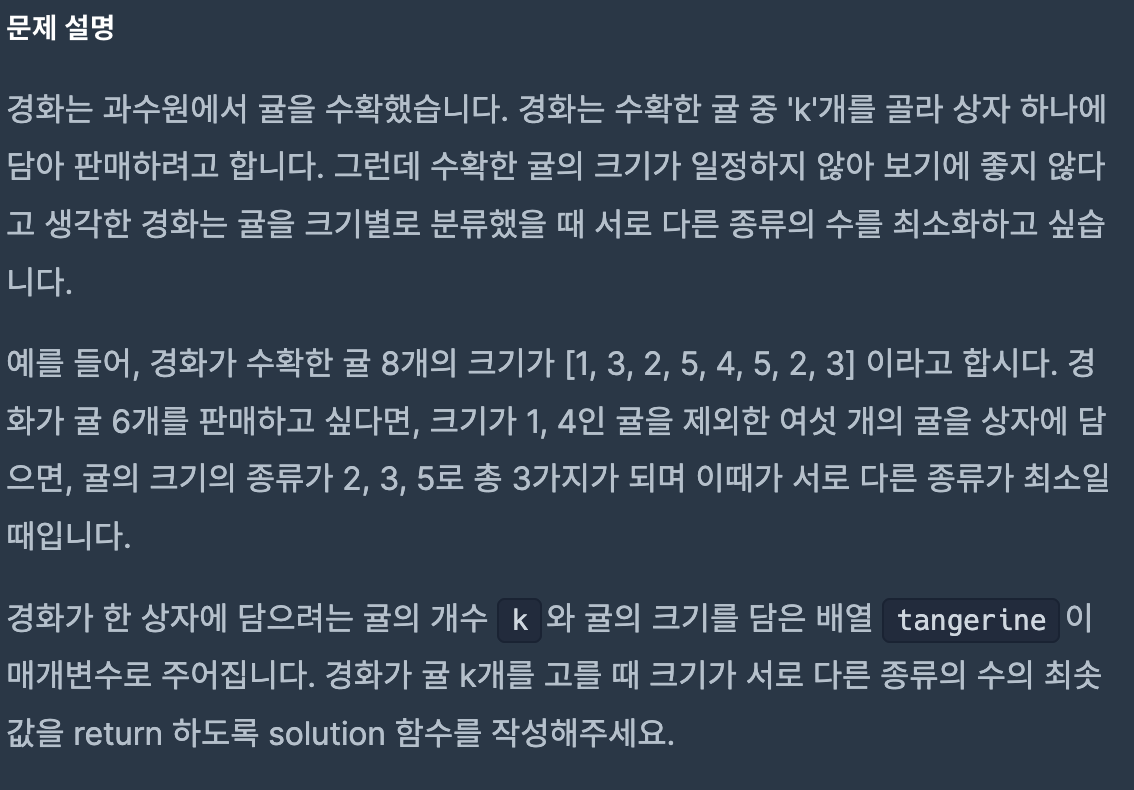 k개를 고를 때 크기가 서로 다른 종류가 총 몇개가 되는지에 대한 문제 처음엔 서로 다른 종류 중 가장 적은 무게를 구하는 줄 알았는데 그게 아니라 단순히 서로 다른 종류 수의 최솟값이다 1. 우선 빈도수 별로 배열을 정리해야겠다고 생각 -> Map 로 바꾸기var map = tangerine.toList().groupingBy{ it }.eachCount()k가 2일 때 [1,1,1,1,2,2,2,3]은 이렇게 정렬된다 {1=4, 2=3, 3=1} 2. 빈도수가 높은 순으로 내림차순 정렬it.value를 더해서 k보다 같거나 크면 끝이니까..!val sortedEntries = map.entries.sortedByDescending { it.value } 3. 서로 다른 종류가 몇 종류가 들어가야하는..