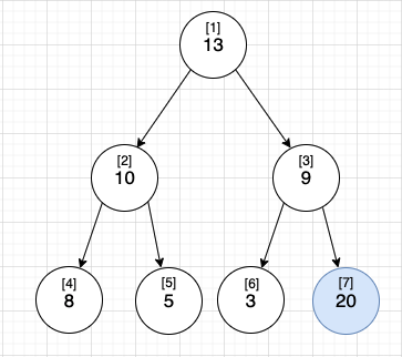 - 부모노드보다 크면 부모노드와 교환, 모든 노드가 최대힙을 만족할 때까지 진행