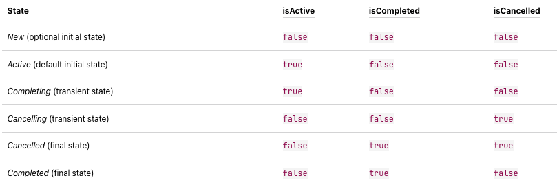 • start : job을 실행하고, 현재 코루틴이 동작중이면 true, 준비 ・ 완료면 false를 반환합니다.