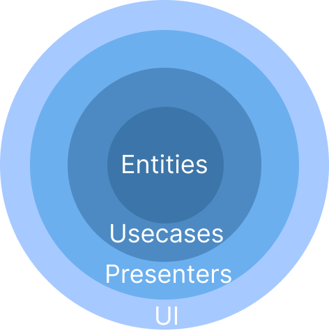 (Entities <- Usecases <- Presenter <- UI)