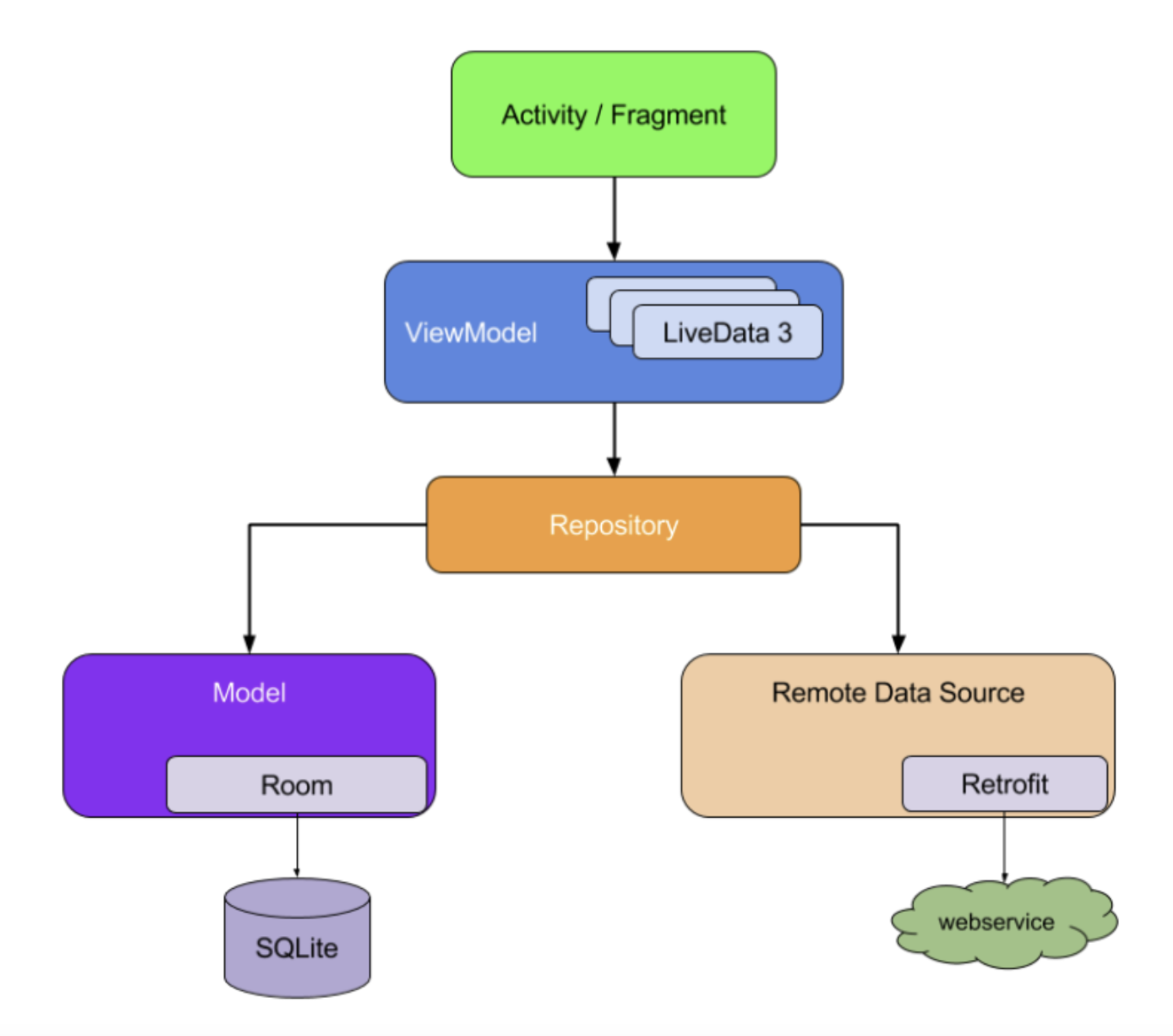 관심사 분리에 따라 권장되는 안드로이드 설계 다이어그램은 아래와 같습니다