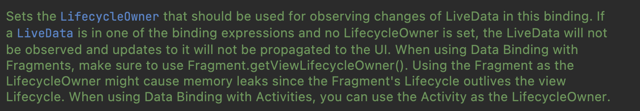그러므로, fragment에서 liveData observe시 메모리 누수 발생을 방지하기 위해서 viewLifecycleOwner의 사용이 권장됩니다