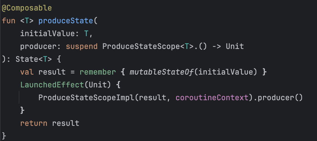 - produceState는 내부적으로 remember를 사용하여 mutableStateOf(initialValue)를 생성