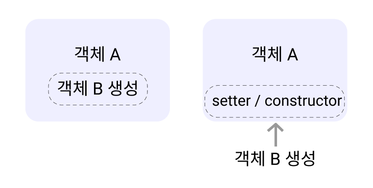 오른쪽은 A 객체 외부에서 B를 생성 후 setter() 혹은 constructor를 통해 A에 주입