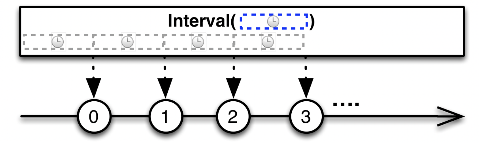 • 주어진 시간 간격의 순서대로 정수를 발행하는 Observable 생성