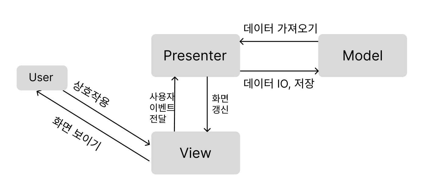 Model과 View는 MVC와 동일하지만 Presenter가 새로운 역할로 등장합니다
