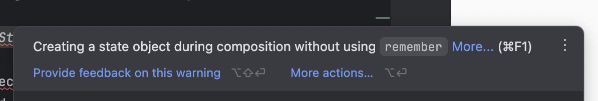 발생원인 : Composable 내에서 ui가 그려질 때 조금 그려지다가 다시 그려질 수 있는데(recomposition이 언제 발생할지 알 수 없다), remember가 없다면 상태값이 날아가버린다