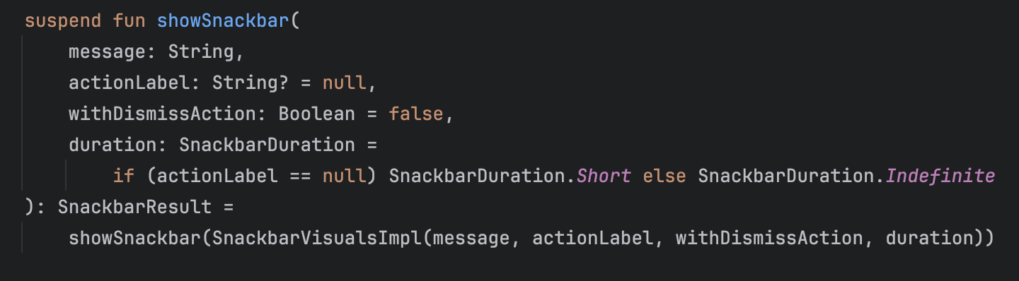 : Snackbar의 showSnackbar 메서드는 suspend 함수로 정의됨 -> Snackbar는 CoroutineScope 내에서 실행되어야 한다
