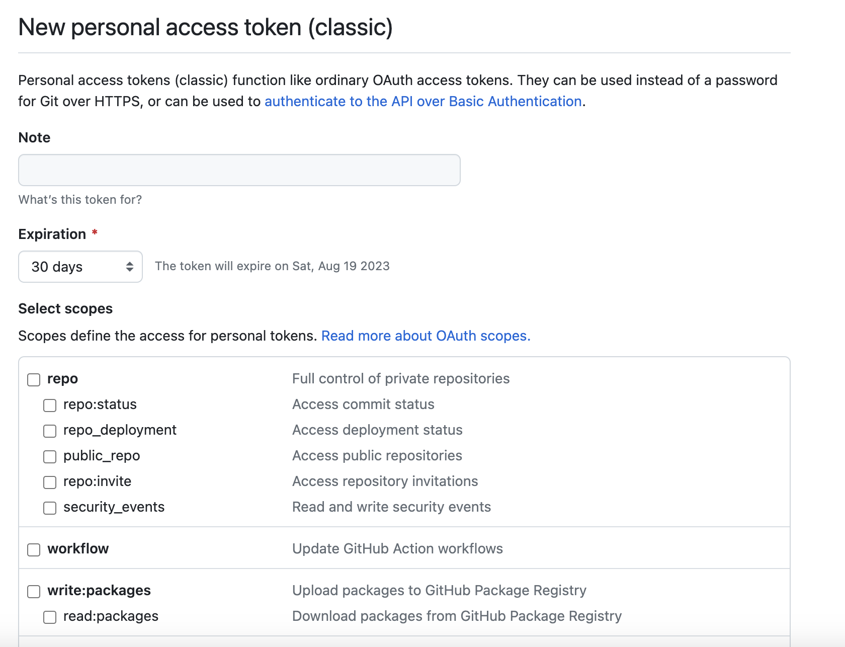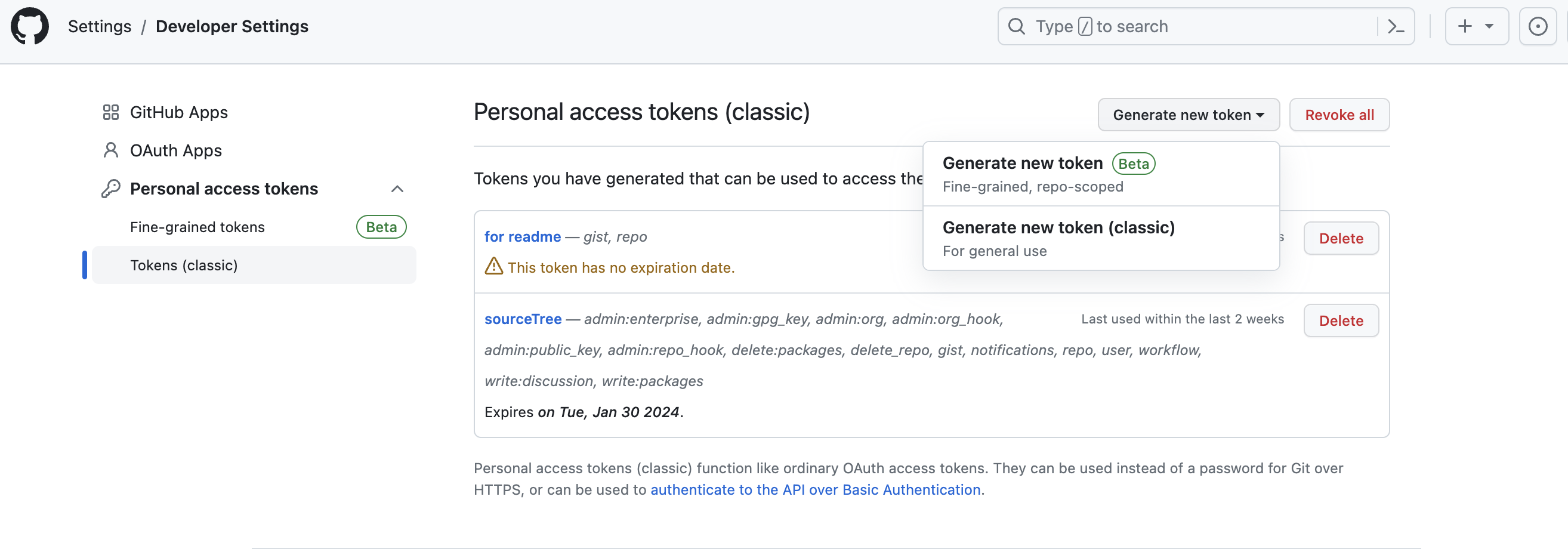 developer settings -> generate new Token (classic) 선택