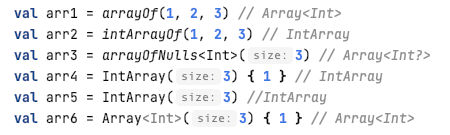 val arr6 = Array<Int>(3) { 1 } // Array<Int>
