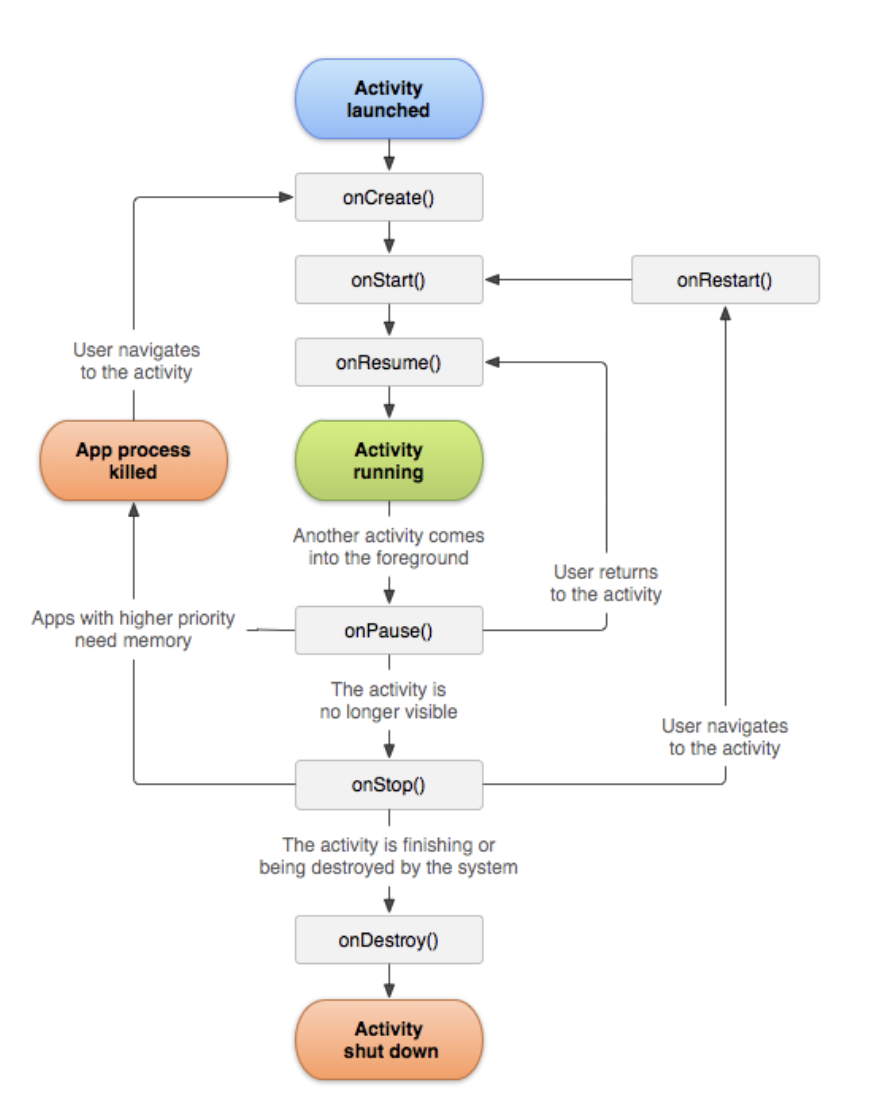 안녕하세요 오늘은 Activity의 LifeCycle에 대해 알아보겠습니다 :) 수없이 봐온 LifeCycle이지만, 더 상세하게 알아둔다면 좀 더 좋은 구조를 가진 앱을 개발할 수 있을 것 같아요 💪 위의 사진 순서대로 알아보겠습니다 1. onCreate() 최초로 1회만 실행되기 때문에 필수로 구현되어야 하는 부분이고, 초기 1회만 실행되어야 하는 부분을 넣어줍니다 주로 setContentView()를 onCreate에서 호출합니다 2. onStart() 사용자에게 화면이 보여질 때 호출되고, 여러 번 호출이 가능합니다 3. onResume() 사용자와 상호작용을 할 수 있을 때 호출되며, 여러 번 호출이 가능합니다 즉, 포커스를 얻을 때 실행되는 부분이며 액티비티가 포커스를 잃기 전까지 이 상태에 ..
